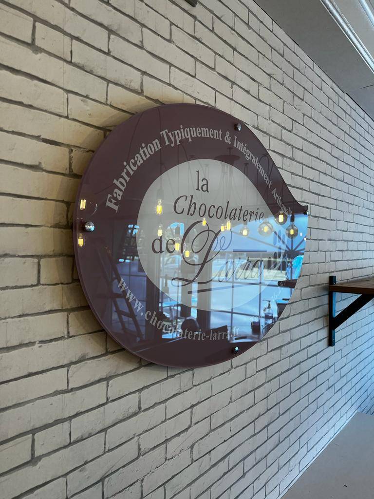 plexi transparent a été découpé en fonction de la forme souhaitée, contrecollage au dos d'une impression HD sur transparent avec blanc de soutien total du logo de la chocolaterie artisanale et permet de