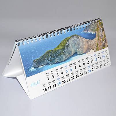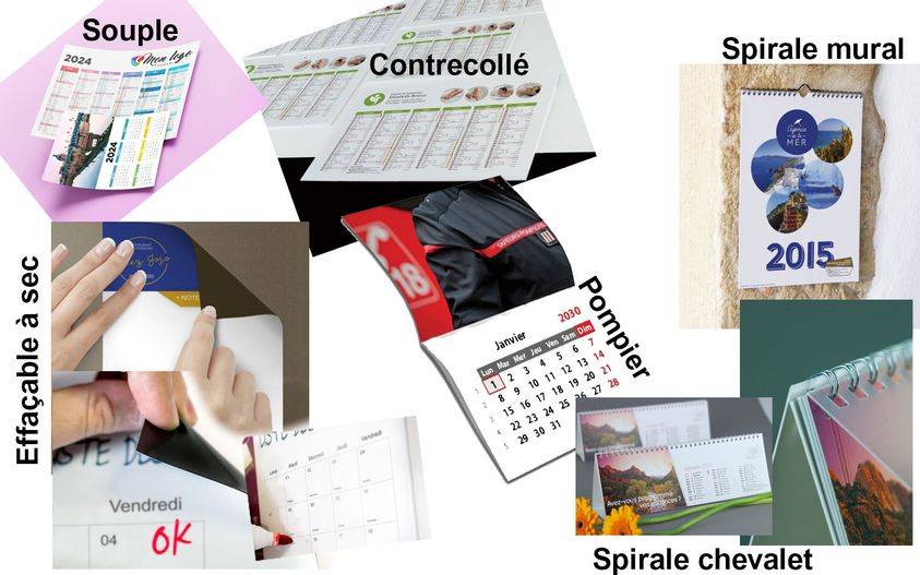Calendrier mural et de table présentés au format horizontal ou vertical, en format classique ou personnalisé, rembordé, découpé, chevalet, pompier, bureau, carte, souple ou rigide...
