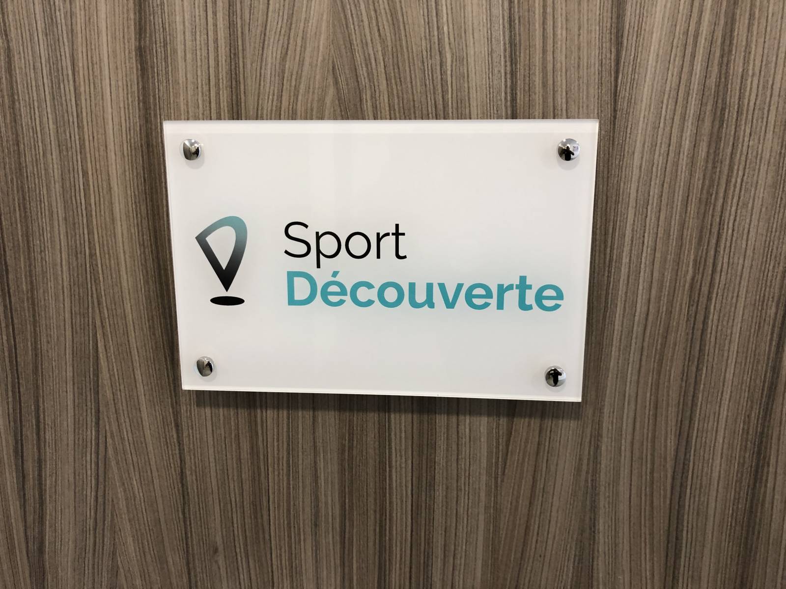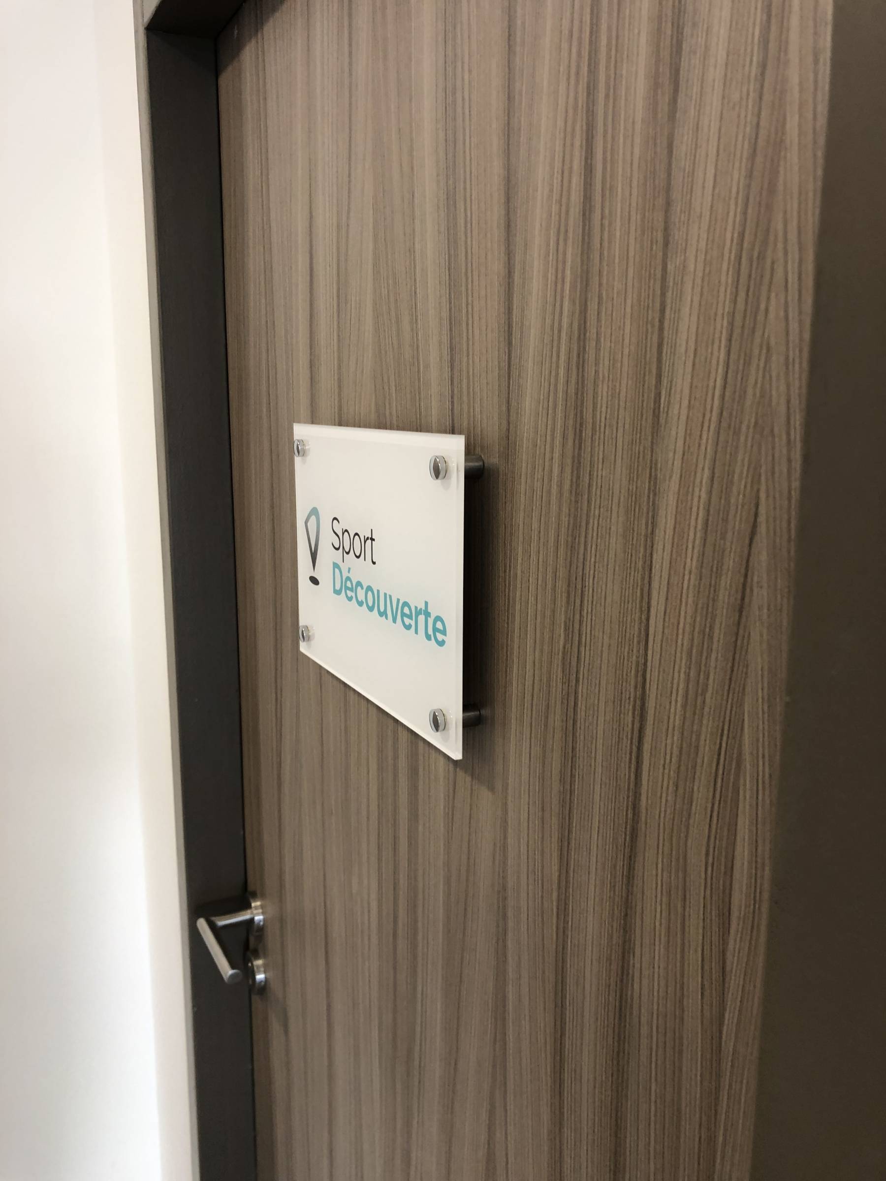 signalétique intérieure avec une plaque de porte en plexi transparent et impression couleur posée sur la porte par des entretoises.
