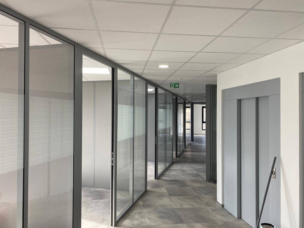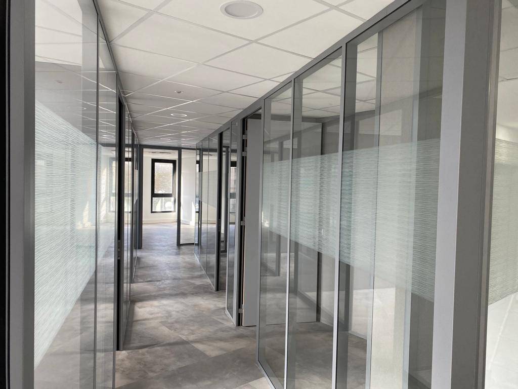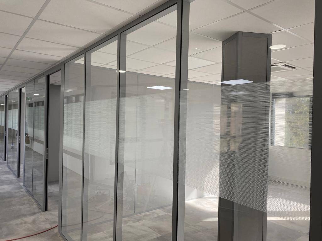 Visuel collé sur la vitre en face extérieure des bureaux.